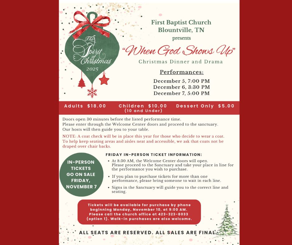 You can purchase tickets by phone beginning Monday, November 10th at 9am. Please call the church office at 423-323-8033