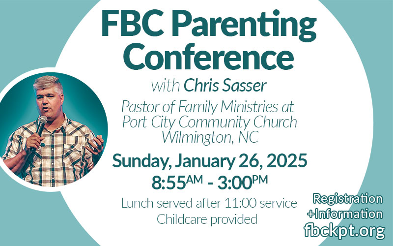 The keynote speaker for the event will be Chris Sasser, Pastor of Family Ministries at Port City Community Church, Wilmington, North Carolina. Sasser will speak at three sessions during the day, with topic breakout sessions in between. The conference will begin at 8:55 am and conclude at 3:00 pm, with lunch and childcare with planned activities provided. Attendance is free, but registration is needed to plan event support. Attendees may come for one or all sessions.