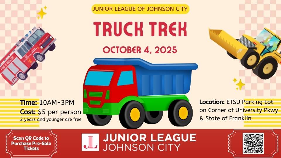 Join the Junior League of Johnson City for our annual family fun event, Truck Trek, Saturday, October 4, from 10AM to 3PM in the ETSU parking lot at the corner of University Parkway and State of Franklin. Need a little calm? Quiet Hour from 2–3 p.m. offers a sensory-friendly experience for families who prefer a gentler pace.
